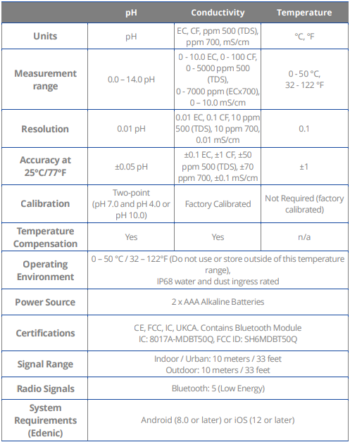 The Bluelab OnePen is a 3-in-1 tool that measures pH, Conductivity (EC/PPM), and Temperature, optimising nutrient uptake. Connect to the Edenic app via Bluetooth for real-time sharing, updates, and comprehensive data management.