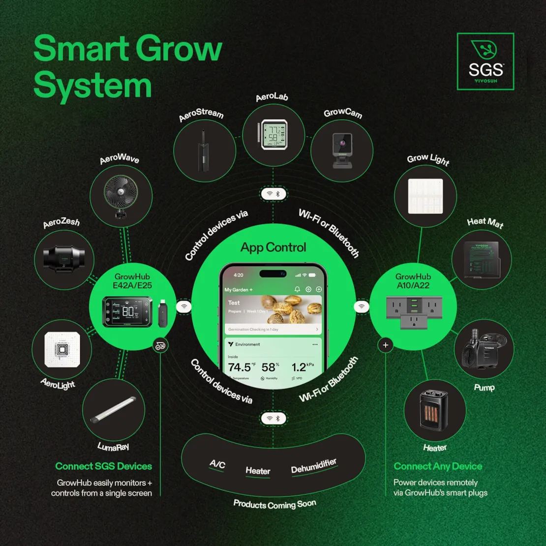 - Smart Control and SGS Compatible:Â WiFi-enabled for seamless connection to the Vivosun app, offering remote control and real-time notifications. Works with the Vivosun Smart Grow System (SGS) to run grow recipes and synchronize with other connected devices.
